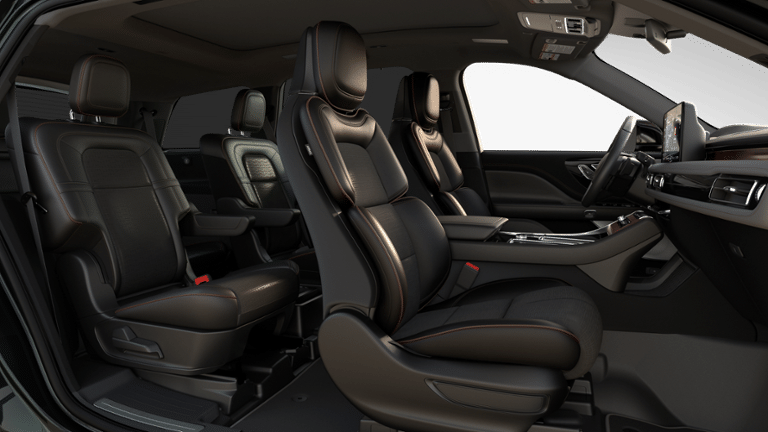 28 Speakers, 3rd row seats: split-bench, 4-Wheel Disc Brakes, ABS brakes, Adaptive suspension, Air Conditioning, Alloy wheels, AM/FM radio: SiriusXM, Apple CarPlay/Android Auto, Audio memory, Auto High-beam Headlights, Auto-dimming door mirrors, Auto-dimming Rear-View mirror, Automatic temperature control, Brake assist, Bumpers: body-color, Compass, Delay-off headlights, Driver door bin, Driver vanity mirror, Dual front impact airbags, Dual front side impact airbags, Electronic Stability Control, Emergency communication system: 911 Assist, Four wheel independent suspension, Front anti-roll bar, Front Bucket Seats, Front Center Armrest, Front dual zone A/C, Front License Plate Bracket, Front reading lights, Fully automatic headlights, Garage door transmitter, Genuine wood console insert, Genuine wood dashboard insert, Head restraints memory, Heads-Up Display, Heated door mirrors, Heated front seats, Heated rear seats, Heated steering wheel, HVAC memory, Illuminated entry, Knee airbag, Leather steering wheel, Lincoln Digital Experience, Low tire pressure warning, Memory seat, Navigation System, Occupant sensing airbag, Outside temperature display, Overhead airbag, Overhead console, Panic alarm, Passenger door bin, Passenger vanity mirror, Power adjustable front head restraints, Power door mirrors, Power driver seat, Power Liftgate, Power moonroof: Panoramic Vista Roof, Power passenger seat, Power steering, Power windows, Radio data system, Rain sensing wipers, Rear air conditioning, Rear anti-roll bar, Rear audio controls, Rear dual zone A/C, Rear reading lights, Rear window defroster, Rear window wiper, Remote keyless entry, Security system, SiriusXM, Speed control, Speed-Sensitive Wipers, Split folding rear seat, Spoiler, Steering wheel memory, Steering wheel mounted A/C controls, Steering wheel mounted audio controls, Tachometer, Telescoping steering wheel, Tilt steering wheel, Traction control, Trip computer, Turn signal indicator mirrors, Variably intermittent wipers, Ventilated front seats, Ventilated rear seats, Wheels: 22 Ebony Black Bright-Machined.